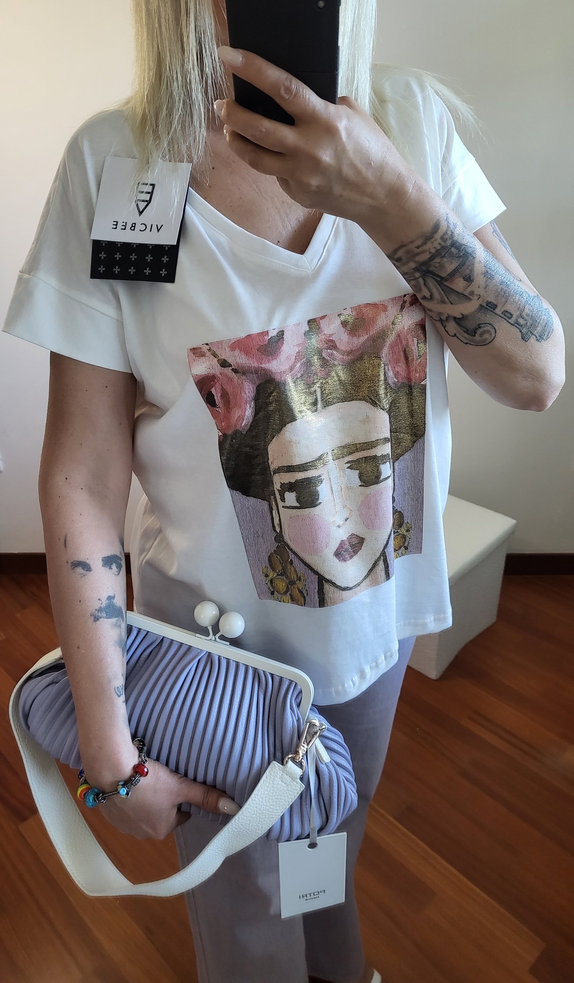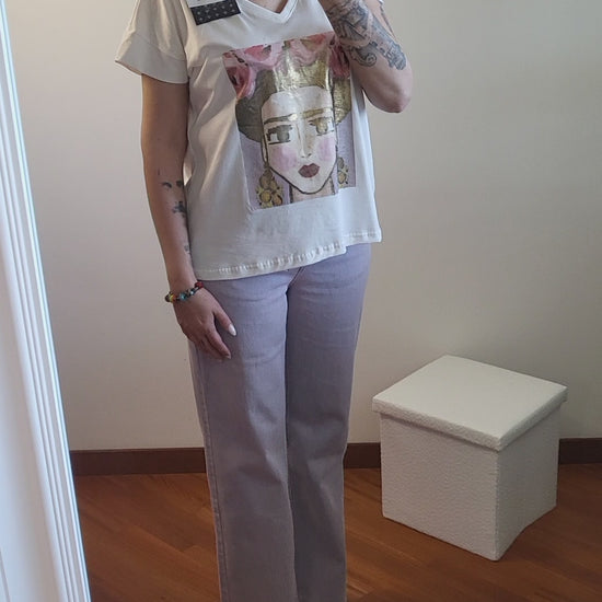 T shirt Frida. Stampa con colori metallici lucidi.
